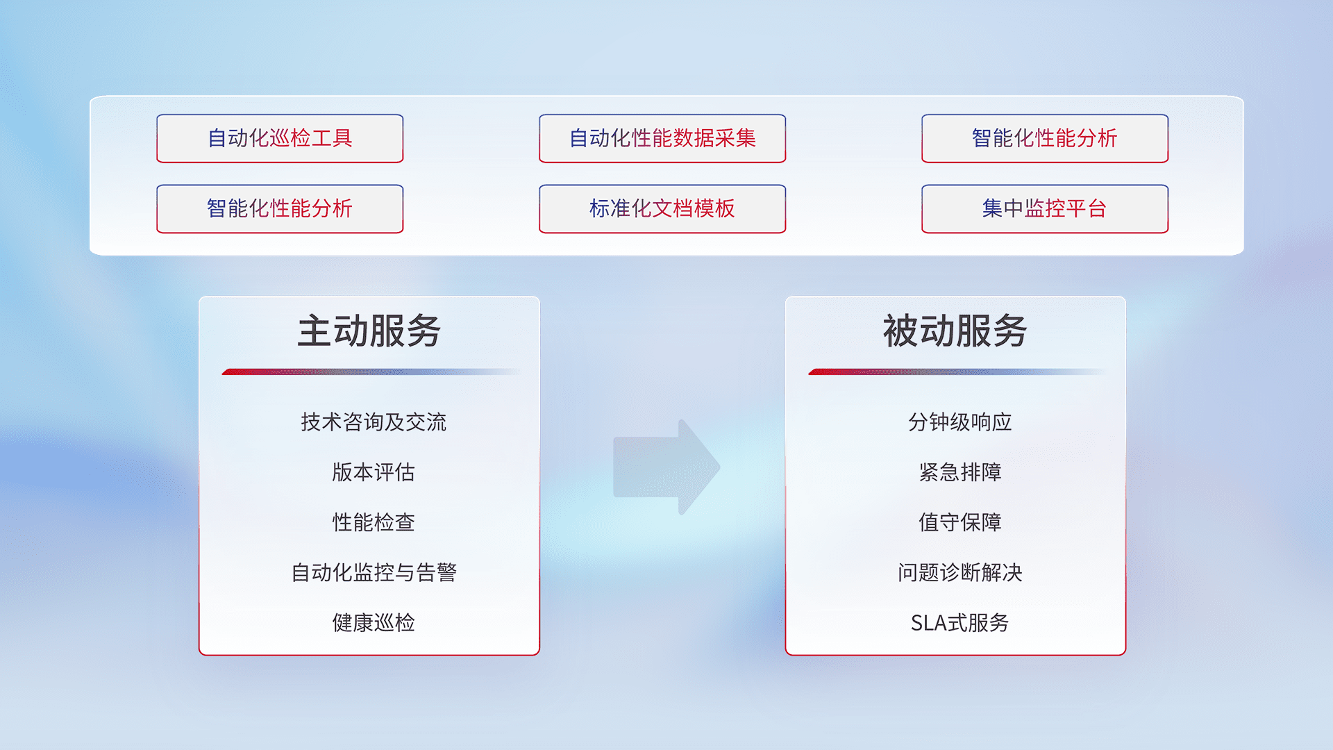 智能化工具和标准化文档,,保障服务质量,,,提供主动服务(包含技术咨询、、版本评估、、、性能检查、、自动化监控与告警、、健康巡检)和被动服务包含(分钟级响应、、、紧急排障、、、、值守保障、、、问题诊断解决、、、、SLA服务)。。。。